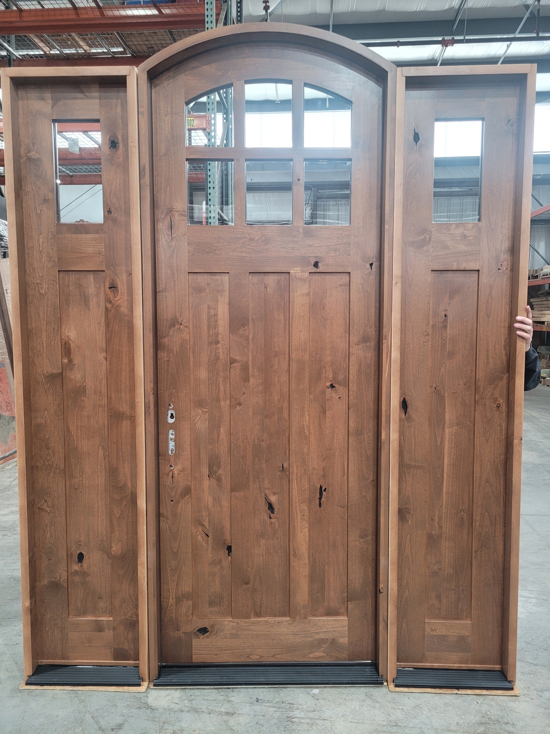 Solid Wood - Arched Knotty Alder Craftsman Door, (Slab Size) 3' 0" x 8' 0", (Glass) Clear Glass, With Sidelite Quantity - 2, With Sidelite Glass - Clear Glass (sidelights loose), with Dental Shelf, Comes completely pre hung with compression weather stripping, door sweep, bronze aluminum threshold, matching species jambs and Brickmold.