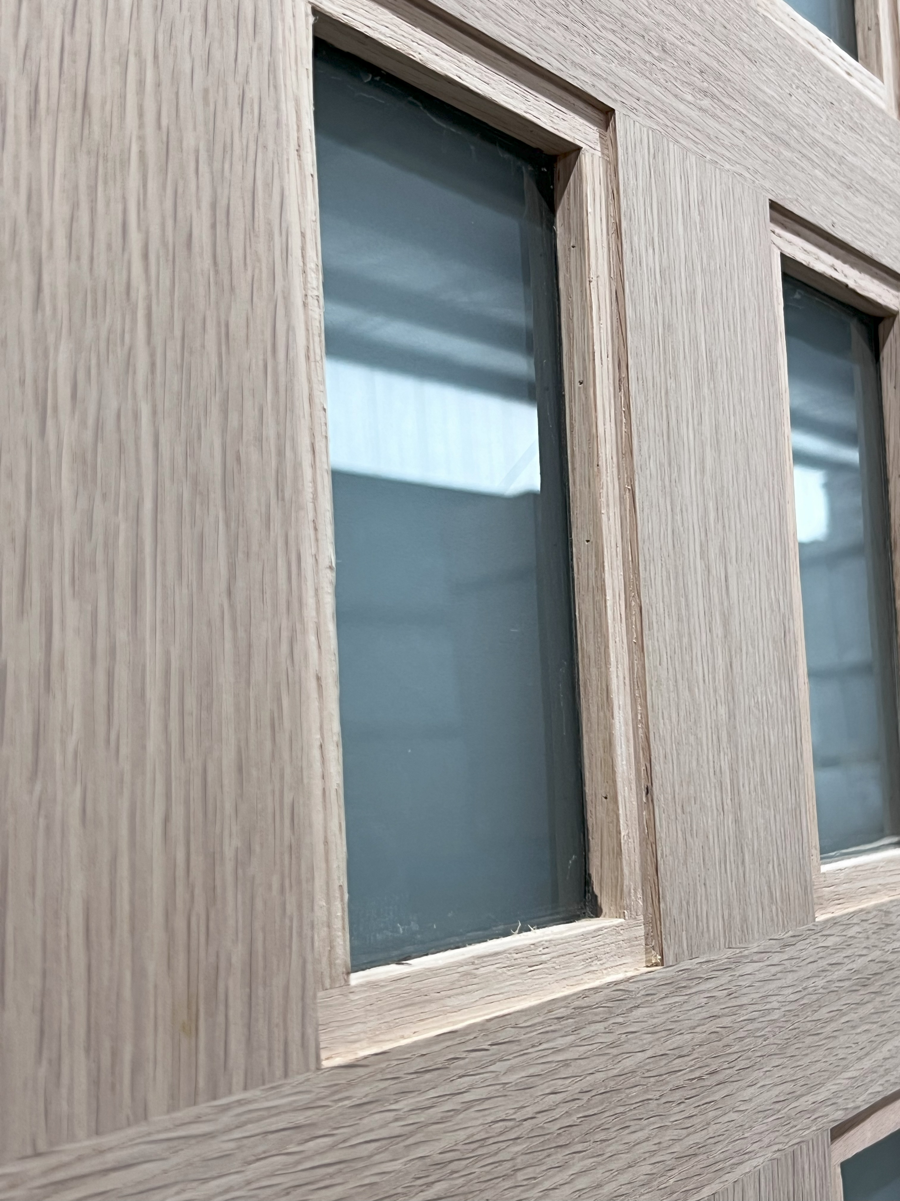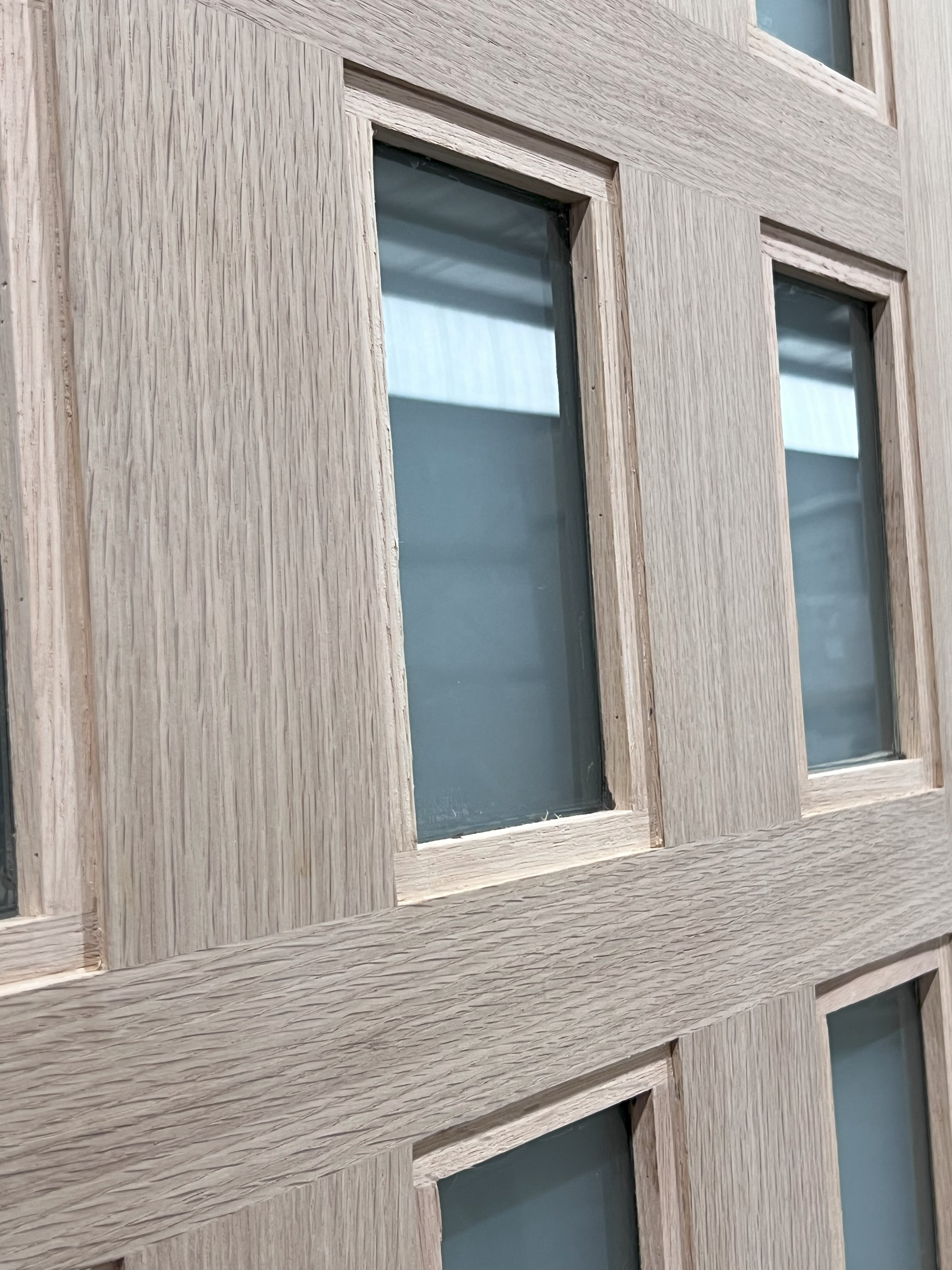 Solid Wood - White Oak 21 Lite Door, (Slab Size) 3'0" x 8'0", (Glass) Frosted Glass Comes completely pre hung with compression weather stripping, door sweep, bronze aluminum threshold, matching species jambs and brickmold.