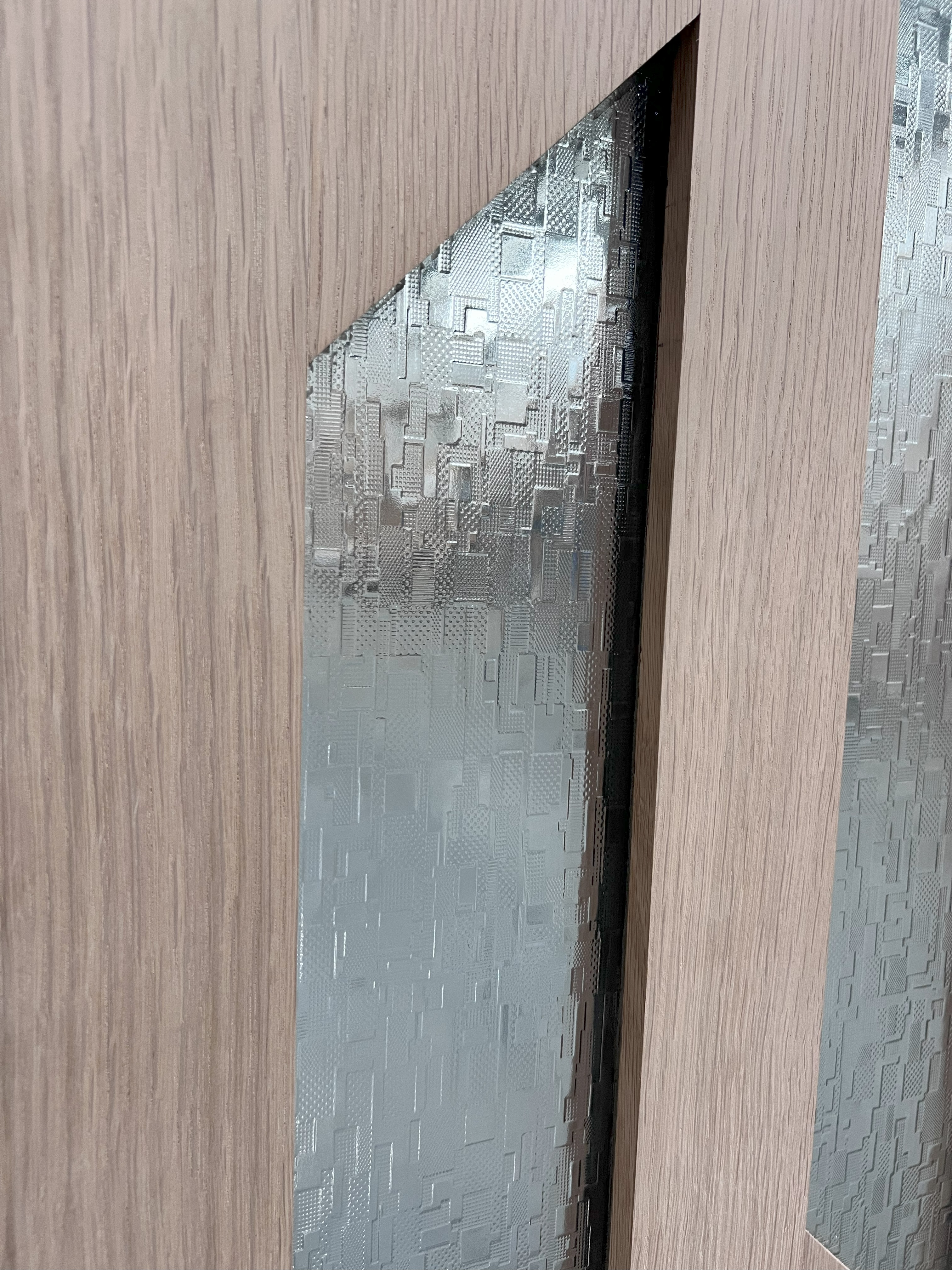 Solid Wood - White Oak 2 Angled Lite 2 panel Door, (Slab Size) 3'0" x 8'0",(Glass) Digital Glass, Comes completely pre hung with compression weather stripping, door sweep, bronze aluminum threshold, matching species jambs and brickmold.