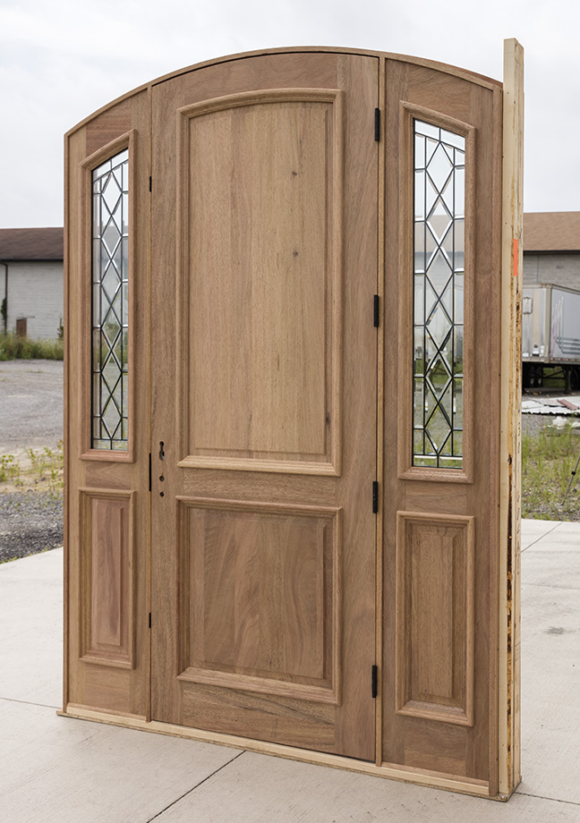 Solid Wood - Bellagio with Panel in Door, (Slab Size) 3'0" x 8'0", With Sidelite Quantity - 2, With Sidelite Glass - Chateau Glass, Comes completely pre hung with compression weather stripping, door sweep, bronze aluminum threshold, matching species jambs and brickmold and Casing.