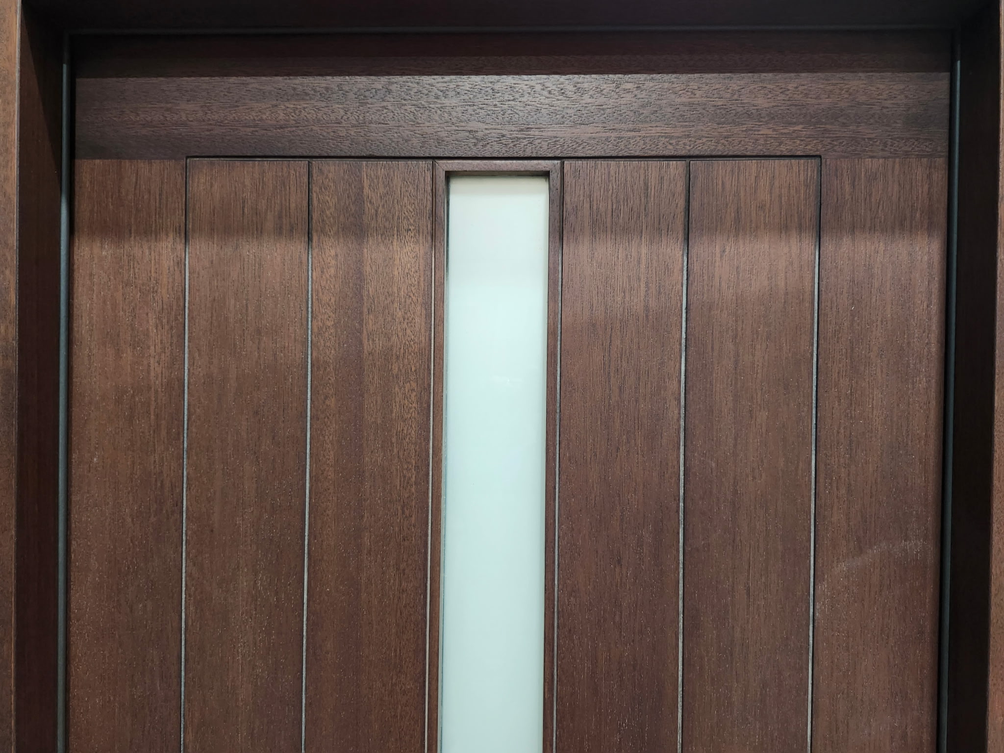 Solid Wood - Mahogany Door, (Slab Size) 3'0" x 6'8",(Glass) Frosted Glass, With Single lite Prehung, Comes completely pre hung with compression weather stripping, door sweep, bronze aluminum threshold, matching species jambs and brickmold.