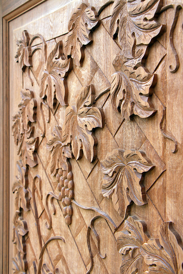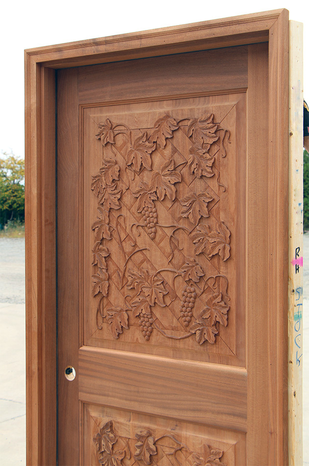 Solid Wood - African Mahogany Carved Door with Grapes and Grape Leaves and vines clinging to Lattice, (Slab Size) 3'0" x 6'8", Comes completely pre hung with compression weather stripping, door sweep, bronze aluminum threshold, matching species jambs and brickmold.